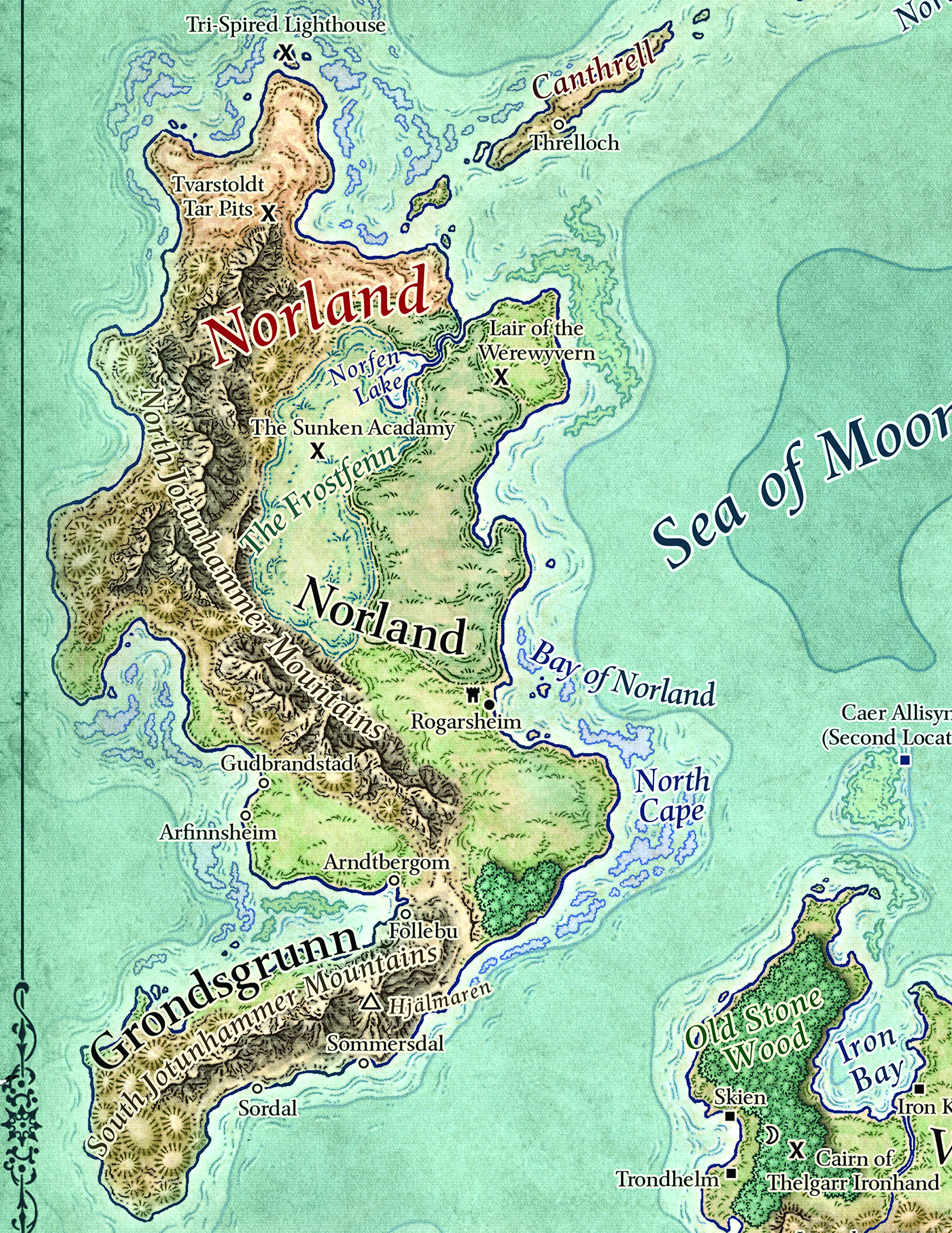 Jotunhammer Mountains. This range of mountains protects Norland from storms coming in off the Trackless Sea and is the home to a firmly entrenched colony of giants, mainly firbolgs.